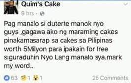 By now you’ve probably heard of the 5 Million worth of cakes that a quaint bakeshop in Quezon City promised to give away for free if ever Mayor Rodrigo Duterte wins the Presidential race. If you don’t know what I’m talking about, you can check out the image below: