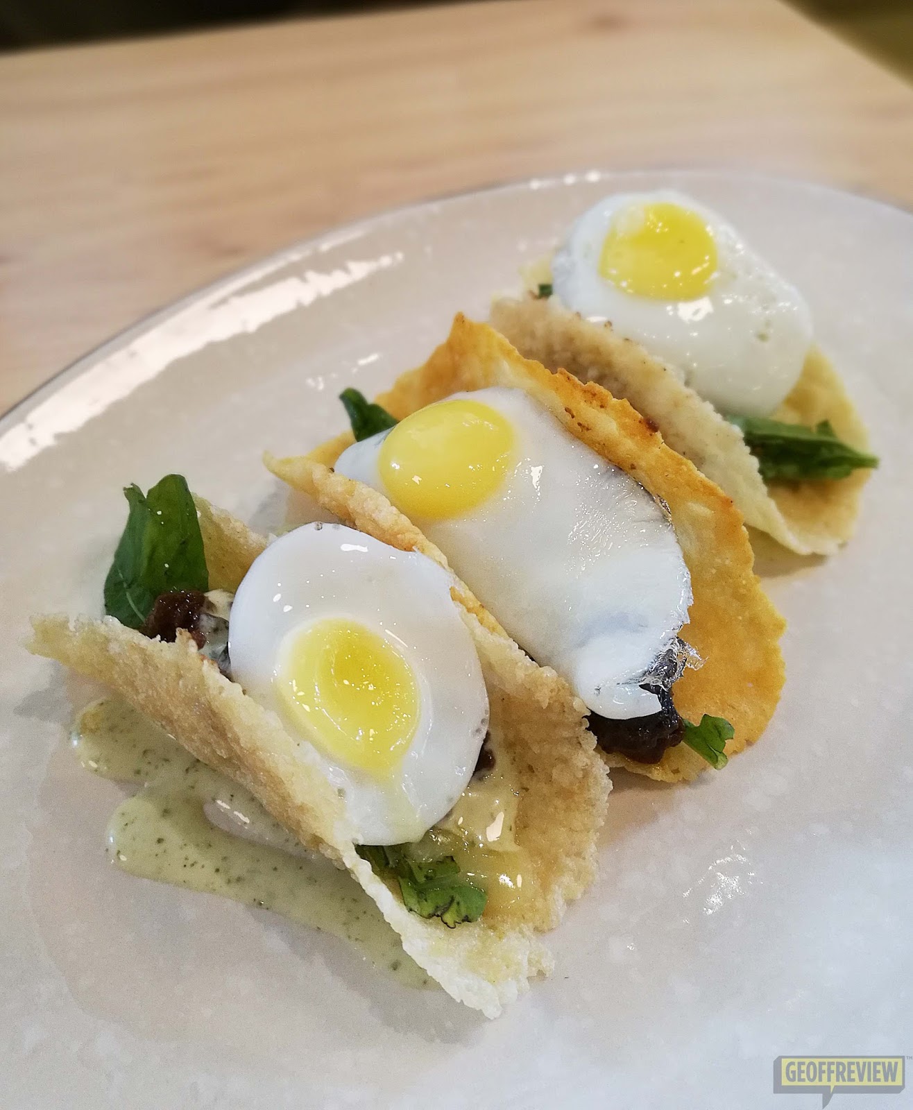 This was surprisingly good. Fried quail eggs sit on top of asada steak and cilantro cream sauce – all blanketed by homemade Parmesan taco shells. The simple ingredients worked so well together, although I wished that each taco had more stuff in them.