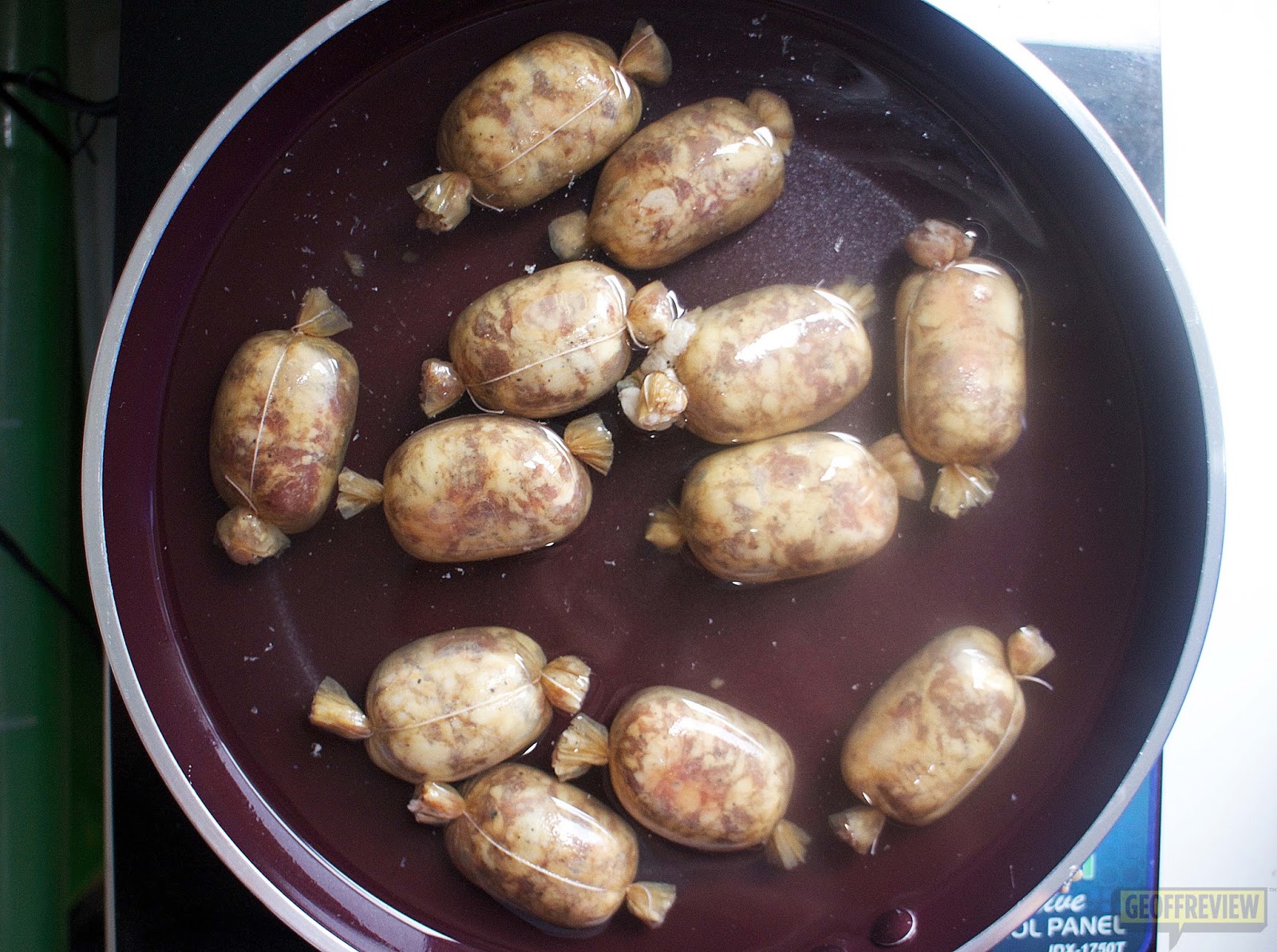 3. Prick the longganisa with a fork, cover, and let simmer over medium heat. (It’s important that you prick so the meat juices don’t get trapped inside the longganisa skin. I forgot to prick them before cooking and the water inside the pieces squirted when I poked holes while cooking! Be careful).