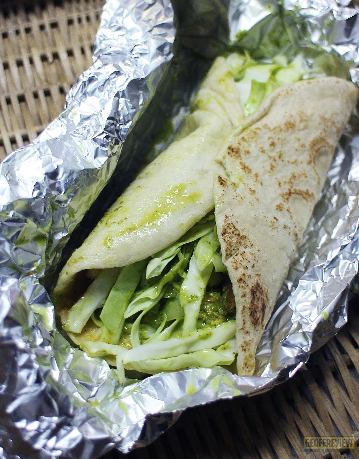 With all those greens, the shawarma actually looked more like a taco to me. The shredded greens are flavored with a tangy sauce and are mixed with what I believe to be either quinoa or ground tofu. Tastes okay but far from the usual shawarma taste, if you ask me.