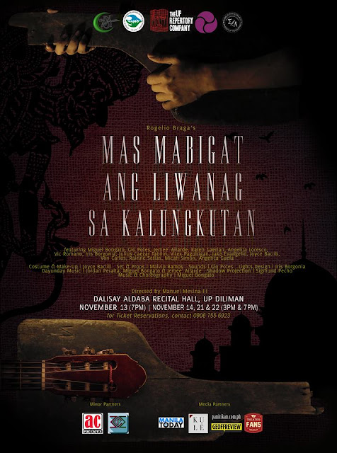 You can still catch Mas Mabigat ang Liwanag sa Kalungkutan (Light Falls Heavier Than Sorrow) on Nov 21 and 22 (3pm &7pm). For tickets you may get in touch with Joyce at 09067556923.