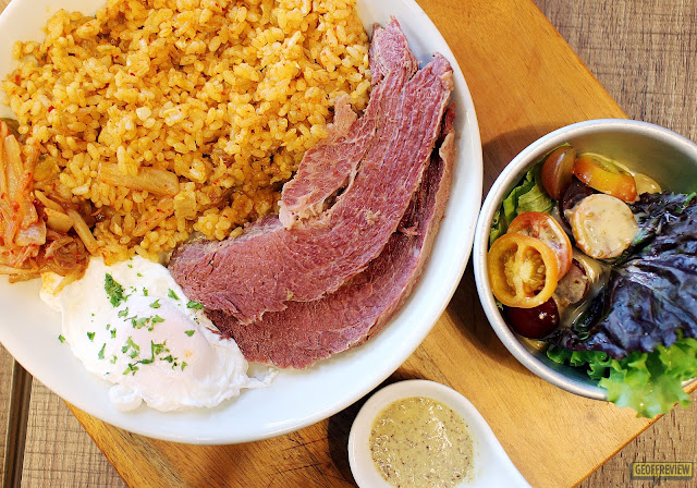 Corned beef is one of my favorite breakfast foods, although it’s not very often that the word “fresh” comes along with the name. The moment I saw it I understood why – unlike the shredded or chunky corned beef that we’re used to, this one’s in the form of sliced beef pieces, served with poached egg and salad on the side. It’s good that the beef’s taste isn’t overwhelming given that you’re going to have it with kimchi rice.