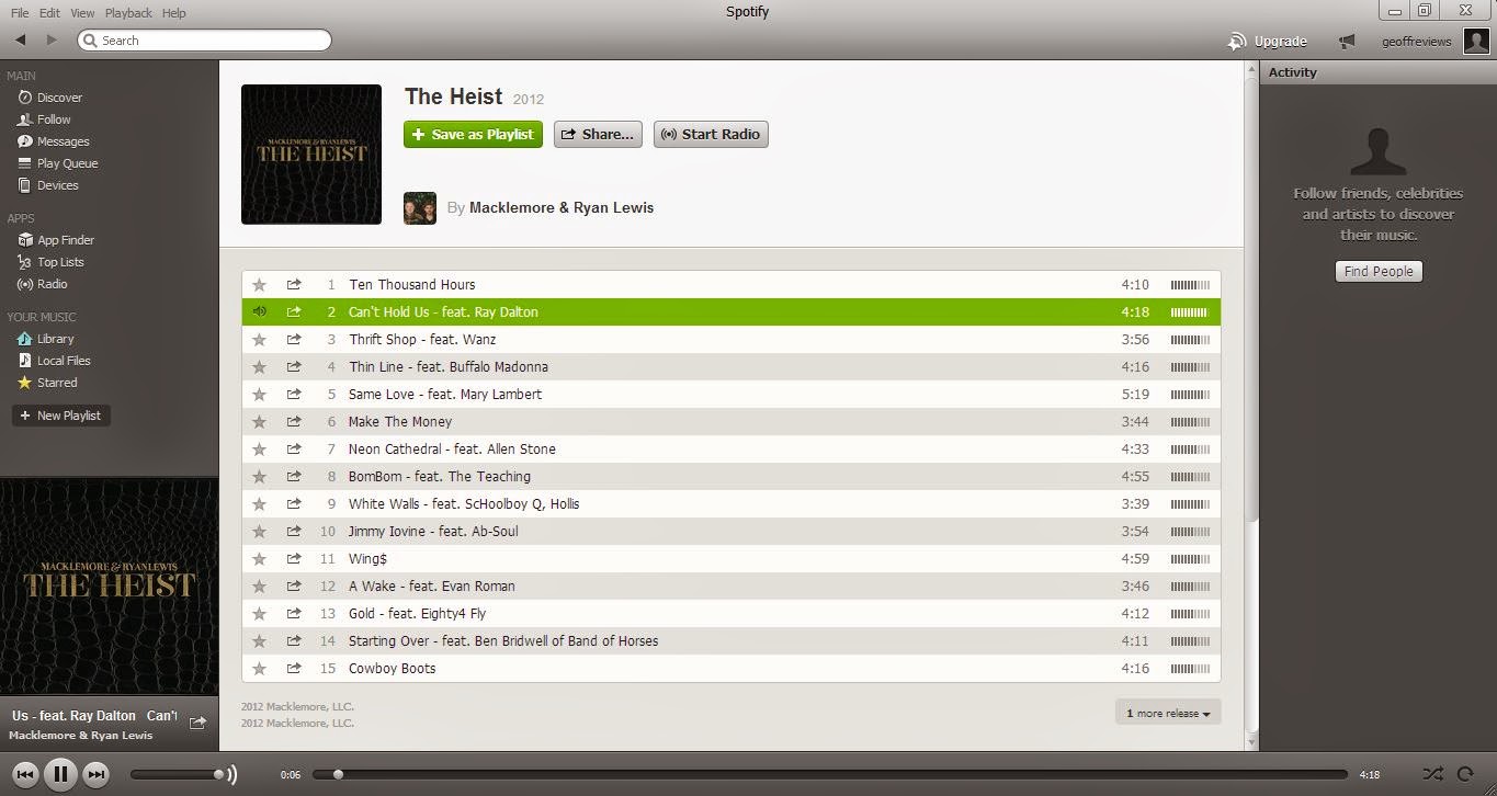 Upon logging in, I was able to browse through songs sorted by genre, mood, themes, song, or artist. You can also listen to playlists created by other Spotify users, and exchange lists with each other.